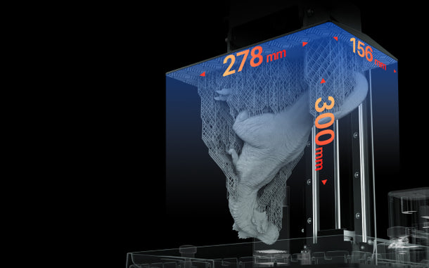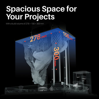 With a build volume of 277.848 x 156.264 x 300 mm³/10.94x6.15x11.81 inches, this provides you ample space for more ambitious projects.